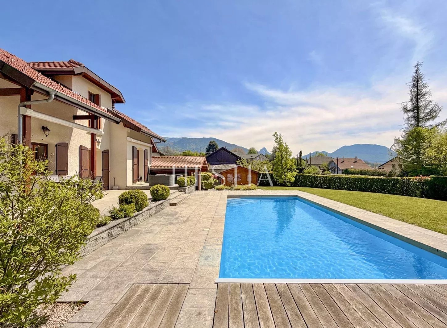 A 20 minutes d'Annecy et 35 minutes de Genève, très belle maison individuelle avec piscine sur terrain de 2075m² avec piscine. Entrée avec vestiaire, grand salon avec cheminée, cuisine équipée, 5 chambres dont une suite parentale, 2 salle de bains, toilettes séparées, salles de sport, garage double, cave. Terrasses plein sud.